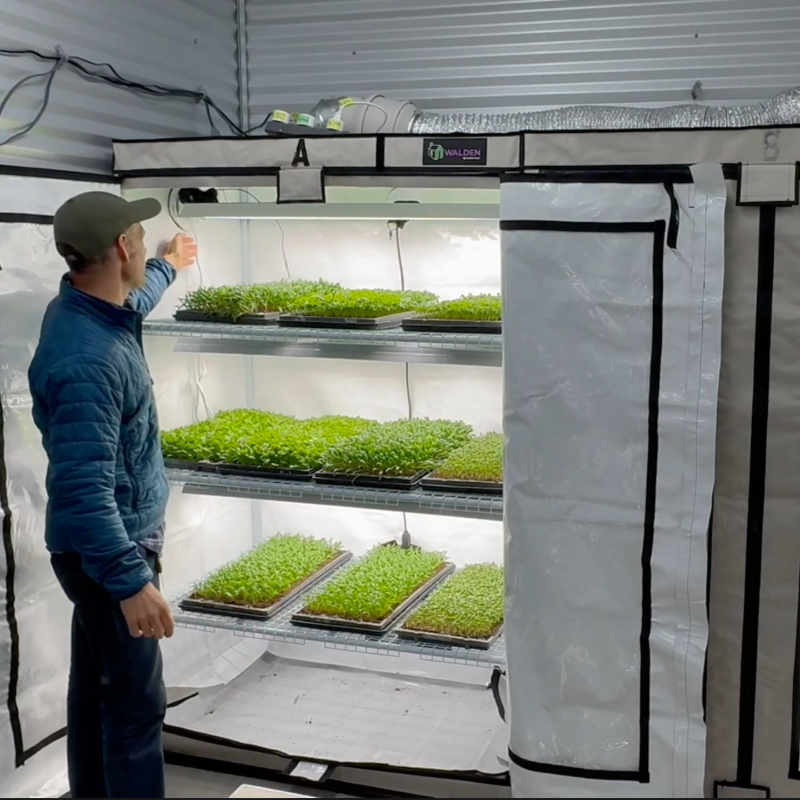 Ben uses the Greens & Veggies Walden grow tent kit from Active Grow for seed starting, growing microgreens, and small-scale winter growing.