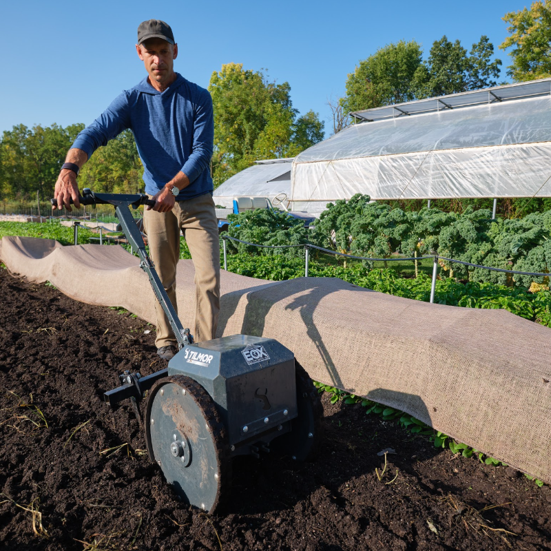 Ben recommends the Tilmor E-Ox electric wheel hoe with these implements: cultivator teeth, side knife, light duty flat shank ripper (x2), plow set kit, and oscillating hoe.