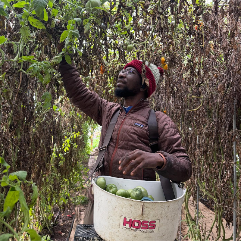 Over the shoulder harvesting buckets from Hoss make tomato, cucumber, and sugar snap pea harvests easy at Clay Bottom Farm.